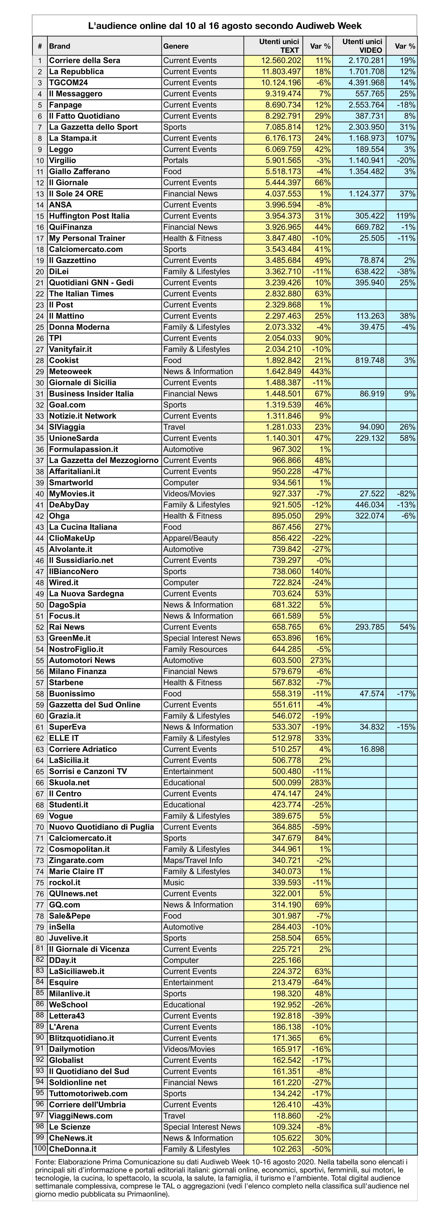 Poche comunque le novità nella top ten. Il Corriere della Sera è sempre in testa con 12,6 milioni utenti unici, l’11% in più rispetto alla terza settimana di luglio. La Repubblica, in crescita del 18%, riconquista la seconda posizione (11,8 milioni), dopo che in luglio era stata superata da TgCom24, ora ritornato terzo (10,1 milioni, -6%). Invariate le quattro posizioni successive, occupate nell’ordine dal Messaggero (+7%), Fanpage (+12%), Il Fatto Quotidiano (+29%) e La Gazzetta dello Sport (+12%). La Stampa sale due gradini e si piazza all’ottavo posto (+24%); Leggo cresce del 42% e sale dalla dodicesima alla nona posizione, mentre Virgilio scende dall’ottava alla decima (-3%).