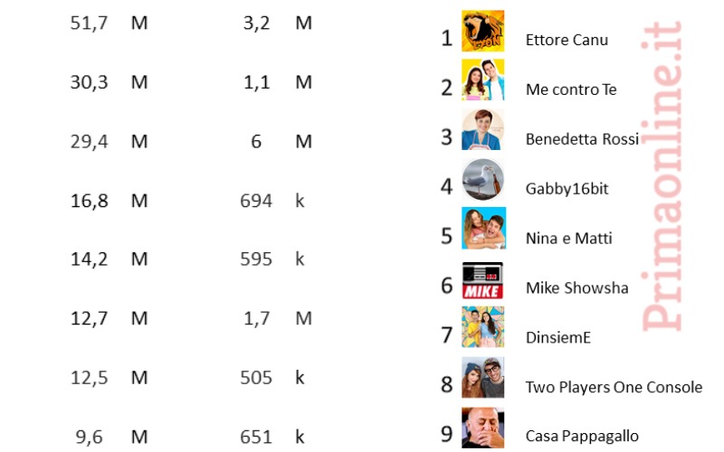 Per quanto riguarda la classifica dei video più performanti, troviamo al primo posto un video di Sofi e Lui, in arte Me contro te, che fanno da babysitter alla barboncina della madre della ragazza. Video che ha raggiunto più di due milioni di visualizzazioni.