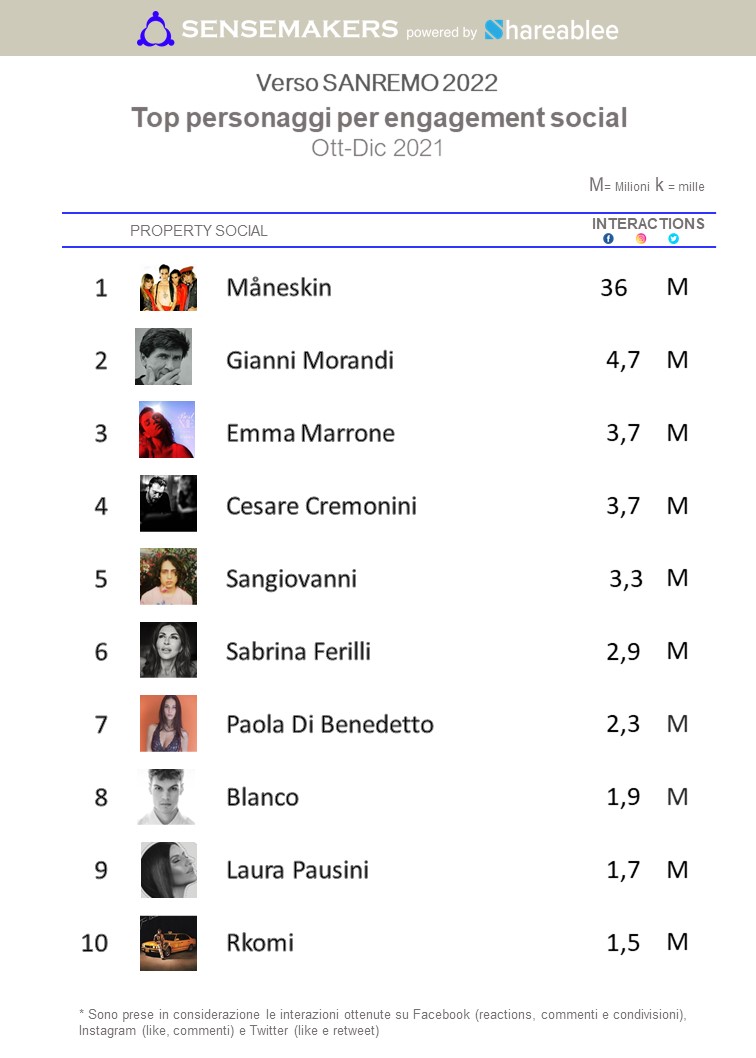 Seguono nell’ordine Emma, che nel periodo di analisi (ottobre-dicembre 2021) ha beneficiato dell’esposizione social come giudice di X-Factor, l’altro superospite Cesare Cremonini, e due nuove leve della musica italiana esplose nell’ultimo anno come Sangiovanni (che può contare sul seguito costruito durante e dopo la partecipazione ad Amici) e Blanco, in mezzo ai quali si posizionano una delle co-conduttrici, Sabrina Ferilli, e Paola Di Benedetto, che sarà impegnata nella striscia “PrimaFestival”.