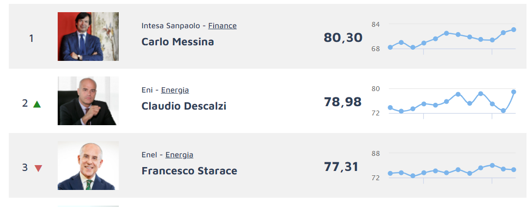 La parola chiave del mese è infatti attivismo: un manager su due è intervenuto in prima persona per prendere posizione nel conflitto, condannando l’aggressione russa o con iniziative di vicinanza al popolo ucraino. Carlo Messina (80.30), che con Intesa Sanpaolo ha donato 10 milioni di euro per misure di solidarietà e accoglienza, si conferma al primo posto. Claudio Descalzi (78.98) di Eni, forte dei risultati del 2021, sale al secondo. Francesco Starace (77.31) è terzo, in crescita Matteo Del Fante (75.05) di Poste Italiane, che ha siglato il protocollo d’intesa con il Forum del Terzo e annunciato l’aquisizione di Lis Holding. Il cluster energetico, nonostante la crisi ucraina, conferma altri tre protagonisti in top15: Stefano Antonio Donnarumma (73.47) di Terna sale al quinto, Renato Mazzoncini (72.17) di A2A è settimo, stabile Marco Alverà (60.30) di Snam. Il settore che più ha fatto sentire la propria voce contro la guerra è quello della moda. «Il battito del mio cuore per la sofferenza dei bambini costretti a scappare» ha detto Giorgio Armani (73.40), inaugurando la sua sfilata silenziosa.