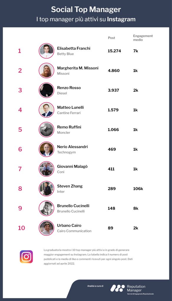 Su Twitter, il social nelle mire del fondatore di Tesla Elon Musk, è possibile notare un’alta percentuale di account inattivi. Un dato che spiega anche perché il tasso medio di crescita degli account Twitter di importanti dirigenti sia fermo a zero. L’inattività prolungata porta alcuni profili addirittura a perdere follower. Non è il caso di Lapo Elkann, il manager che nel trimestre fa registrare la migliore performance (+13%). Reputation Manager ha analizzato anche l’attività e l’engagement medio generato dai post pubblicati su Instagram dai manager ai vertici di grandi aziende attive in Italia. A guidare la classifica è sempre il mondo del fashion. Spicca la performance di Steven Zhang: il presidente dell’Inter ha ottenuto 106 mila reazioni di media, l’engagement più alto fatto registrare nel periodo.