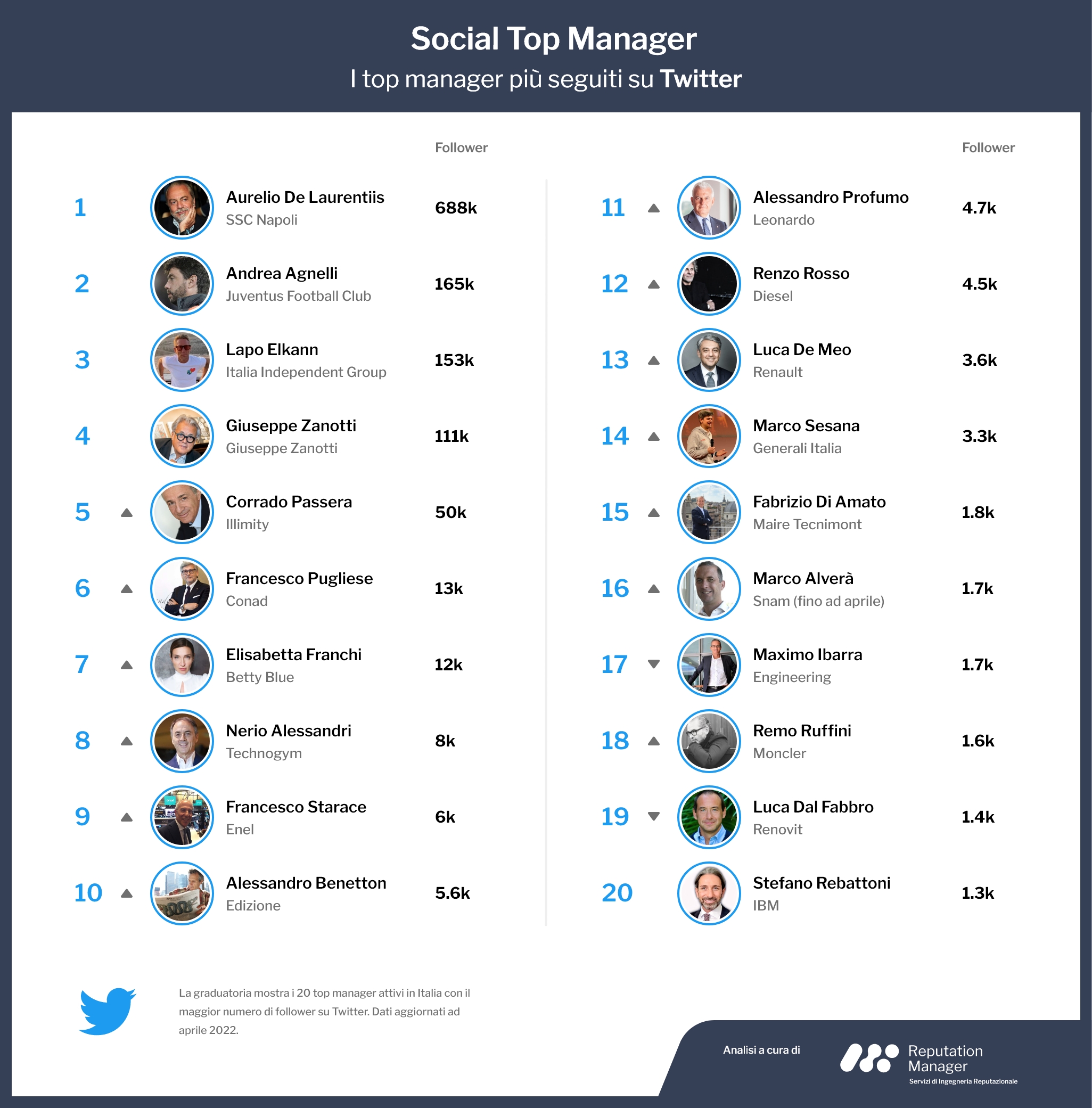 I profili più seguiti dei top manager su LinkedIn crescono a un tasso medio del +7%. Più contenuta, invece, la crescita su Instagram: qui il tasso medio di aumento dei seguaci è del 2%. Twitter, al netto di poche eccezioni, non presenta crescita. Tre i grandi temi che hanno guidato la comunicazione su LinkedIn dei top manager in questo ultimo trimestre: le molteplici questioni del conflitto russo-ucraino, le tematiche relative al mondo Esg (Environmental, Social e Governance) e il problema delle forniture energetiche. Al vertice della classifica degli executive più seguiti su questa piattaforma si conferma Stephan Winkelmann di Lamborghini (116 mila follower), davanti a Luca de Meo di Renault (85 mila) e all’ex ceo di Snam Marco Alverà (69 mila).