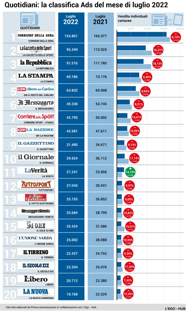 Rispetto a giugno, luglio fa respirare i quotidiani. Ma il confronto con il 2021, per diffusione e vendite, è una pioggia di meno. Si salva la Verità