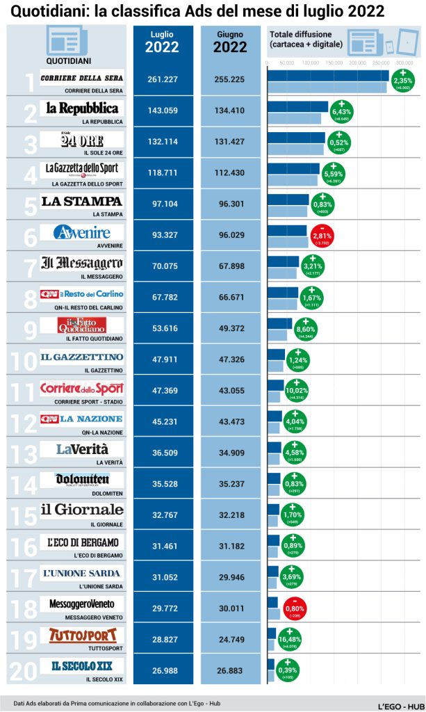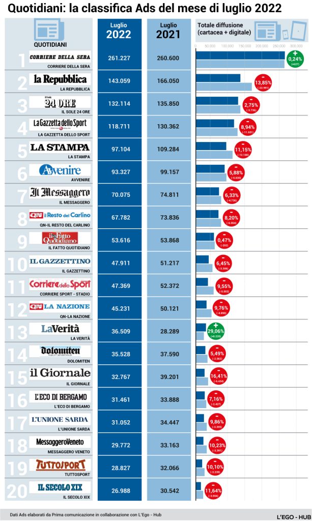 Classifiche e trend dei quotidiani elaborate da Primaonline.it sugli ultimi dati Ads, riferiti al mse di luglio.