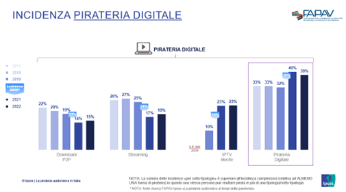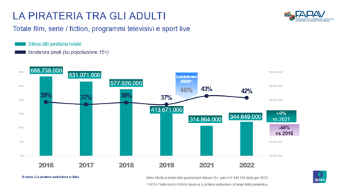 42%: incidenza complessiva della pirateria di film, serie/fiction, programmi e sport live. (43% nel 2021, 37% nel 2019, 38% nel 2018, 37% nel 2017, 39% nel 2016).