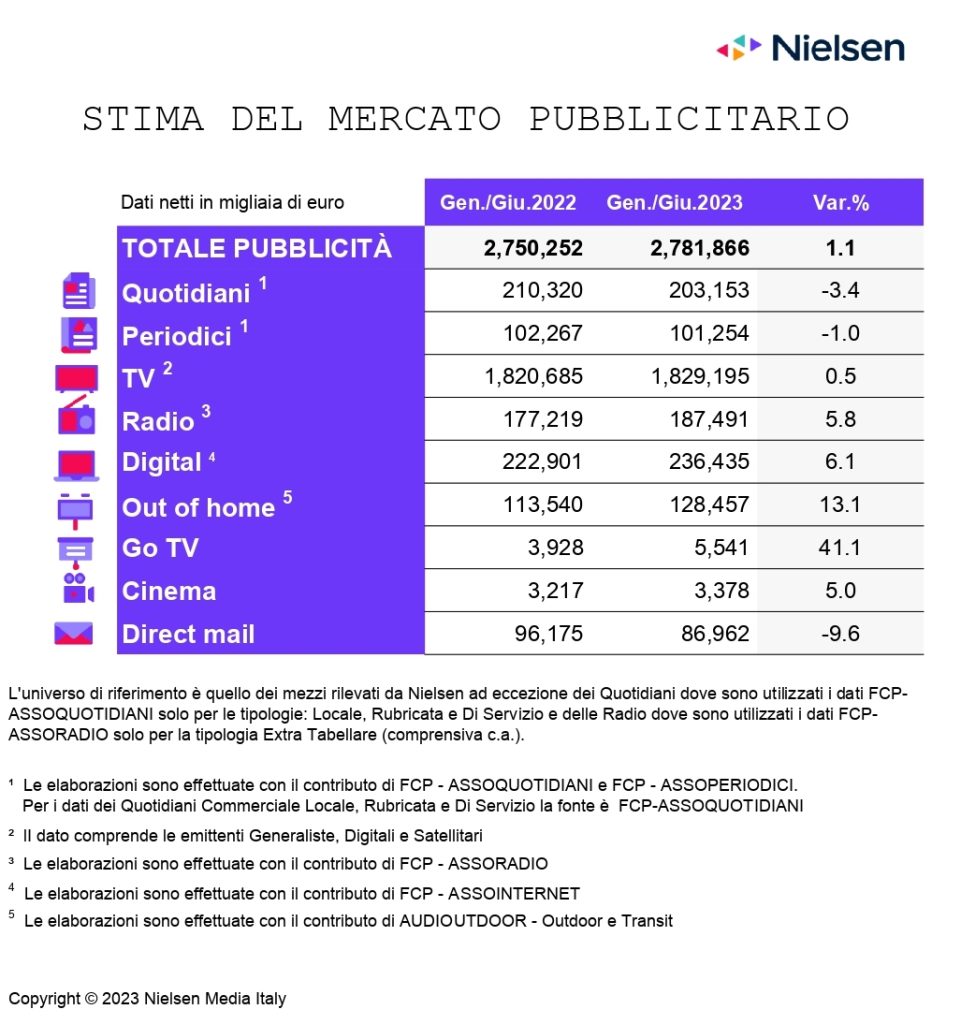 Nielsen ha pubblicato i risultati Ad Intel relativi al mercato pubblicitario nel mese di giugno 2023. Questi vedono gli investimenti in Italia chiudere il mese a +1,4%, portando la raccolta pubblicitaria del primo semestre a +1.9%. Se si esclude dalla raccolta web la stima Nielsen sul search, social, classified (annunci sponsorizzati) e dei cosiddetti “Over The Top” (OTT), l’andamento nel primo semestre del 2023 si attesta a +1,1%.