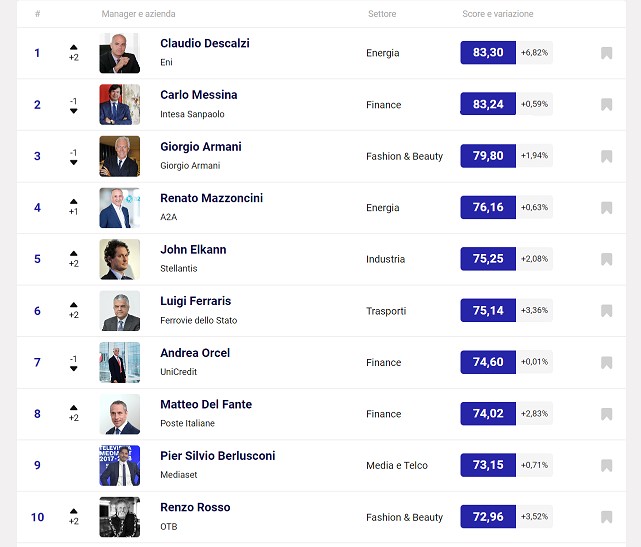 In testa al ranking, si registra la prima posizione di Claudio Descalzi (83.30), salito in vetta guadagnando due posizioni rispetto al mese scorso.