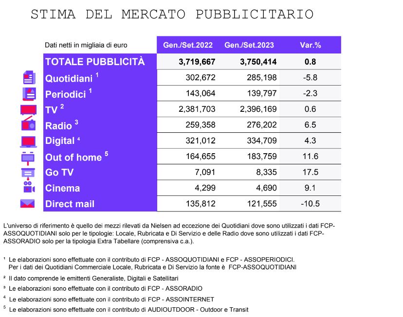 Se si esclude dalla raccolta web la stima Nielsen sul search, social, classified (annunci sponsorizzati) e dei cosiddetti ‘Over The Top’ (OTT), l’andamento nei cumulato gen./set. del 2023 si attesta a +0,8%.