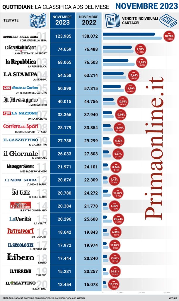 Si tratta ovviamente sempre di dati certificati e forniti da Ads che comprendono il dato aggregato della vendita individuale in edicola e la vendita individuale digitale, non legata a promozioni o offerte speciali. E’ quindi la fotografia “vera” del mercato dei quotidiani, di chi compra il giornale perchè lo vuole davvero e non spinto da un abbinamento a costo irrisorio che spesso finisce per non rinnovare.