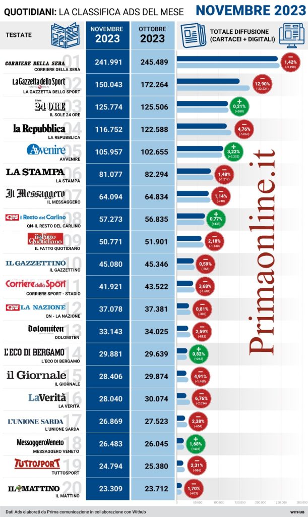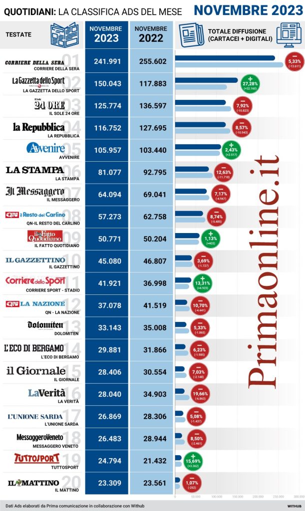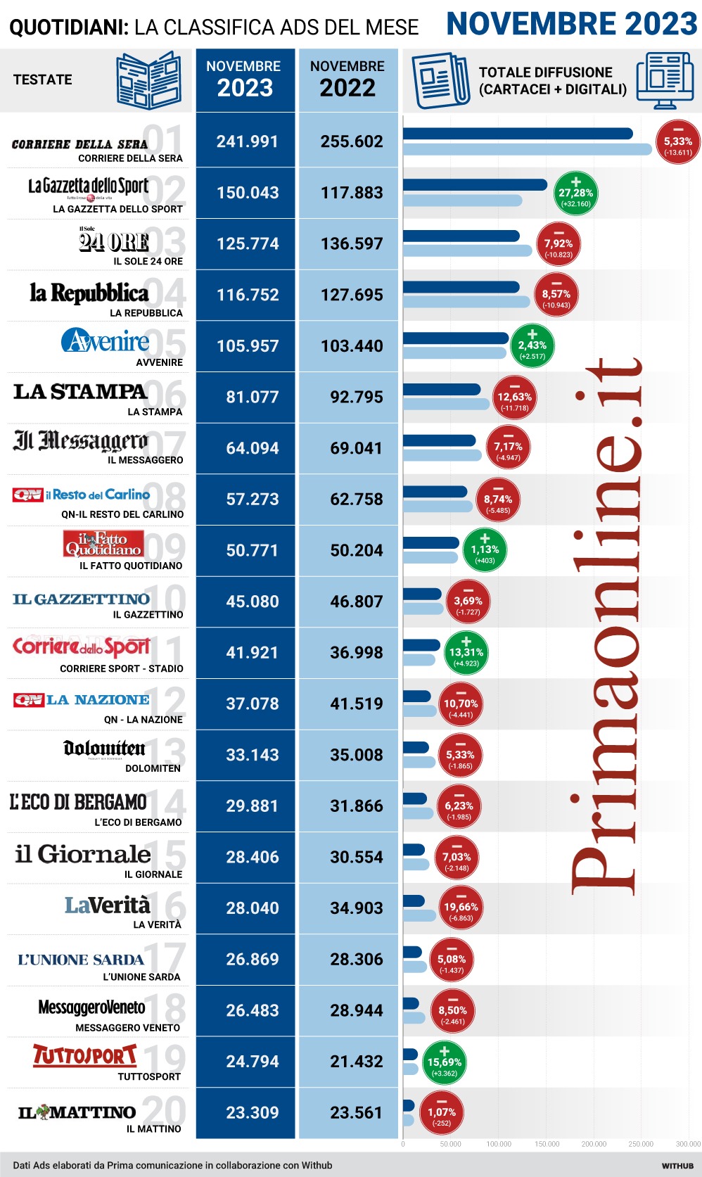 Classifiche e trend dei quotidiani elaborate da Primaonline.it sugli ultimi dati Ads.