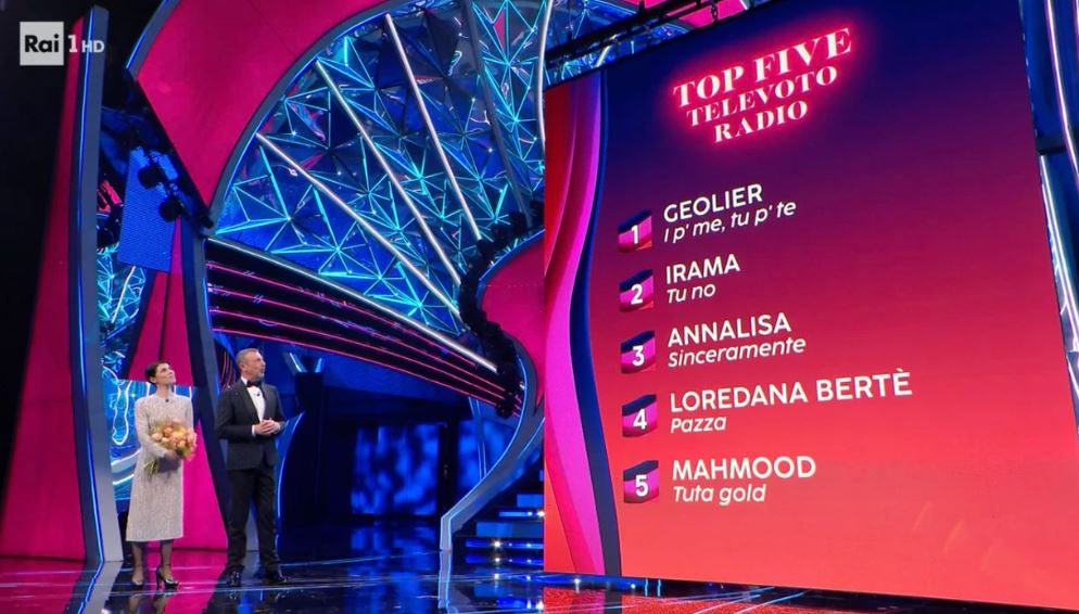 Alla fine, è arrivata la sorprendente top 5 della giuria (radio e televoto) con Geolier in testa davanti a Irama e Annalisa.