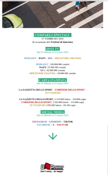 E nella mail pubblicata sui social compare effettivamente l’indicazione di una ‘comparsa speciale’ prevista per il 7 febbraio a Sanremo, proprio il giorno in cui Travolta ha partecipato alla kermesse. “Quello che fa sorridere è che per Mediaset, dazn, Discovery e Sky U-Power annunci sempre nella mail invece veri e propri spot, quindi pagati alle reti -sottolinea Lucarelli- Mentre la Rai, da quel che sembra, non ha preso manco un euro e ora si ritrova pure con l’accusa di pubblicità occulta”. In evidenza un altro tema che ha fatto discutere, ovvero la frase pronunciata da Amadeus ‘don’t worry be happy’ in occasione dell’ospitata di Travolta: “Tra parentesi, come vedete la U-Power inserisce la frase ‘don’t worry be happy’ nella voce mittente nella mail. Quella pronunciata dal conduttore ieri sera assieme a Travolta. Strano no?”, scandisce la giornalista.