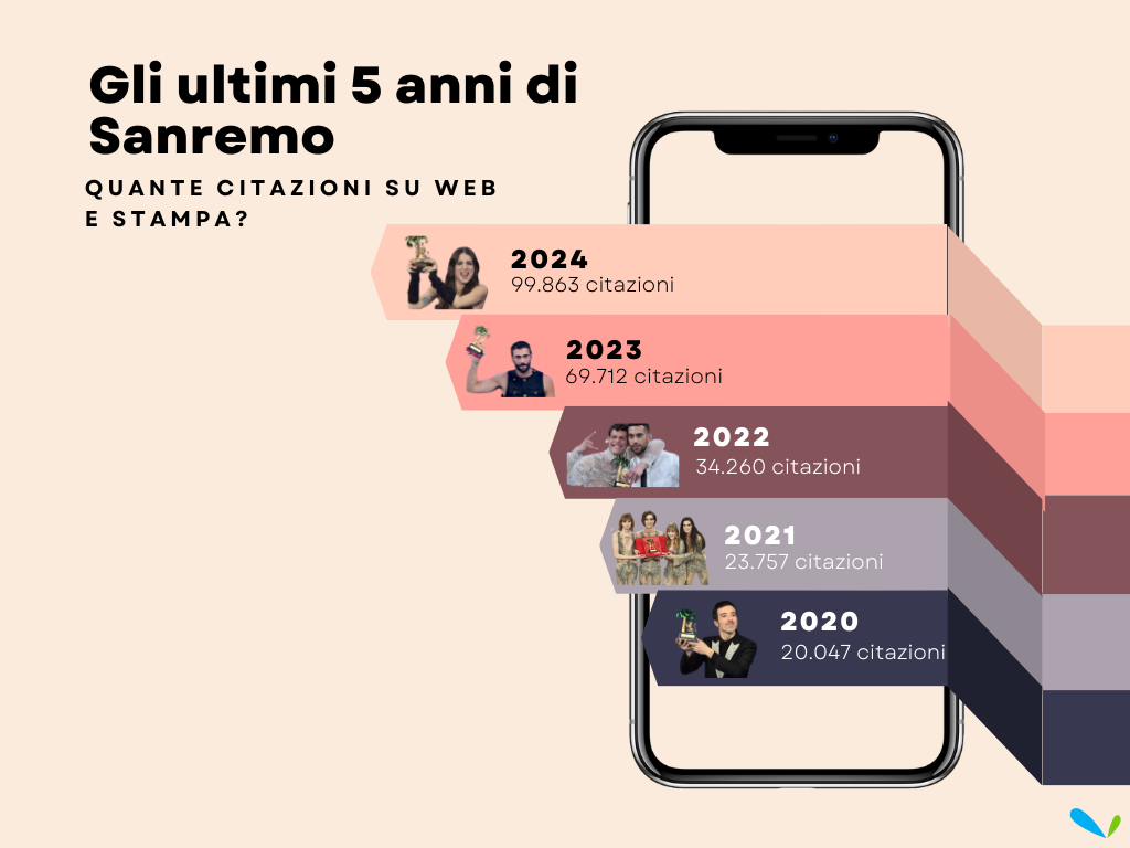 Come abbiamo visto, il 2024 è stato un assoluto successo per il Festival di Sanremo, con più di 99mila citazioni. Non fa una piega, se si pensa che è stato anche l’anno con più share: 74% per l’ultima puntata contro, ad esempio, il 66,5% dell’edizione precedente.