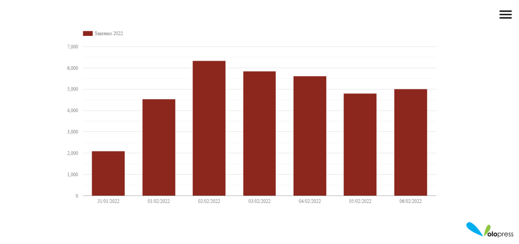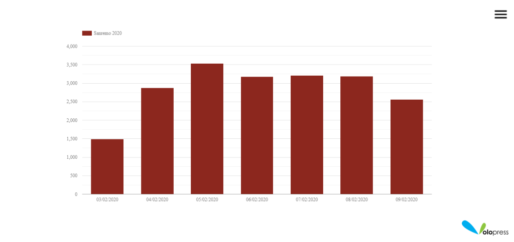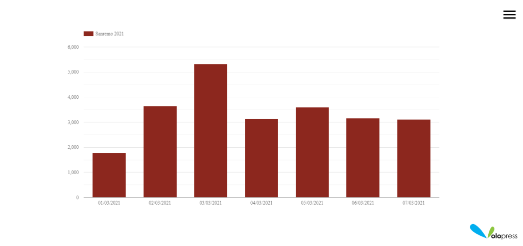 La 71esima edizione del Festival Sanremo si è contraddistinta sicuramente per un particolare, non certo un dettaglio: un Sanremo senza pubblico, a causa della pandemia da Covid-19 che ha costretti tutti a casa. Un’edizione unica nel suo genere: mai ci fu un Sanremo senza il pubblico ad applaudire, fischiare o gioire per gli artisti in gara. Questa edizione ha totalizzato 23mila citazioni fra create e web piazzandosi al quarto posto nel quinquennio preso in esame dagli analisti di Volocom.