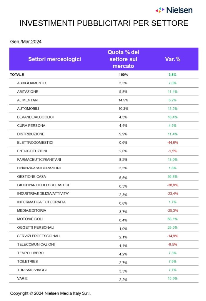 Sono 15 i settori merceologici in crescita nel mese di marzo, il contributo maggiore è portato da Gestione casa (+29%), Turismo/Viaggi (+38,9%), e Distribuzione (+13,8%). In calo a marzo gli investimenti di Media/Editoria (-27%), Servizi Professionali (+28,9%), e Telecomunicazioni (-33,8%).