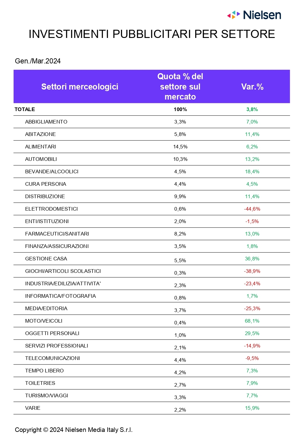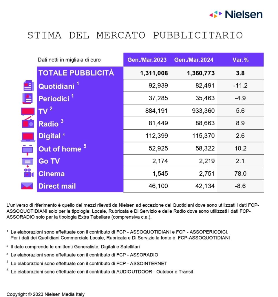 Nielsen ha pubblicato i risultati Ad Intel relativi al mercato pubblicitario nel mese di marzo 2024. Questi vedono gli investimenti pubblicitari in Italia chiudere il mese a +3,4%, portando la raccolta pubblicitaria del periodo cumulato gen./mar. a +3,6%. Se si esclude dalla raccolta web la stima Nielsen sul search, social, classified (annunci sponsorizzati) e dei cosiddetti “Over The Top” (OTT), l’andamento nei cumulato gen./mar. del 2024 si attesta a 3,8%.