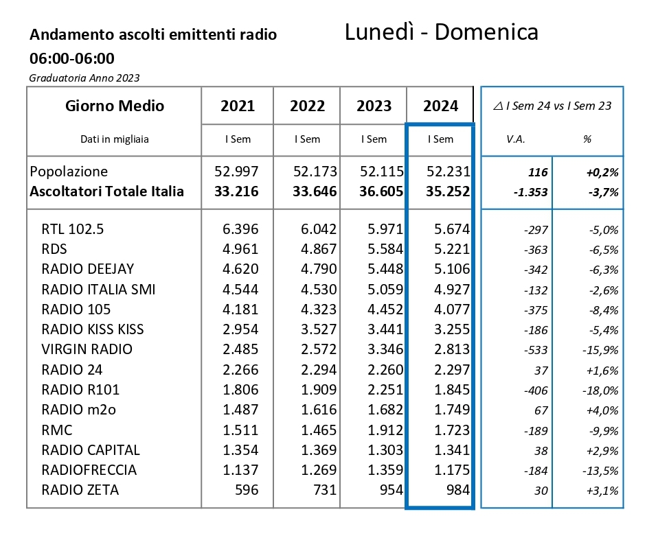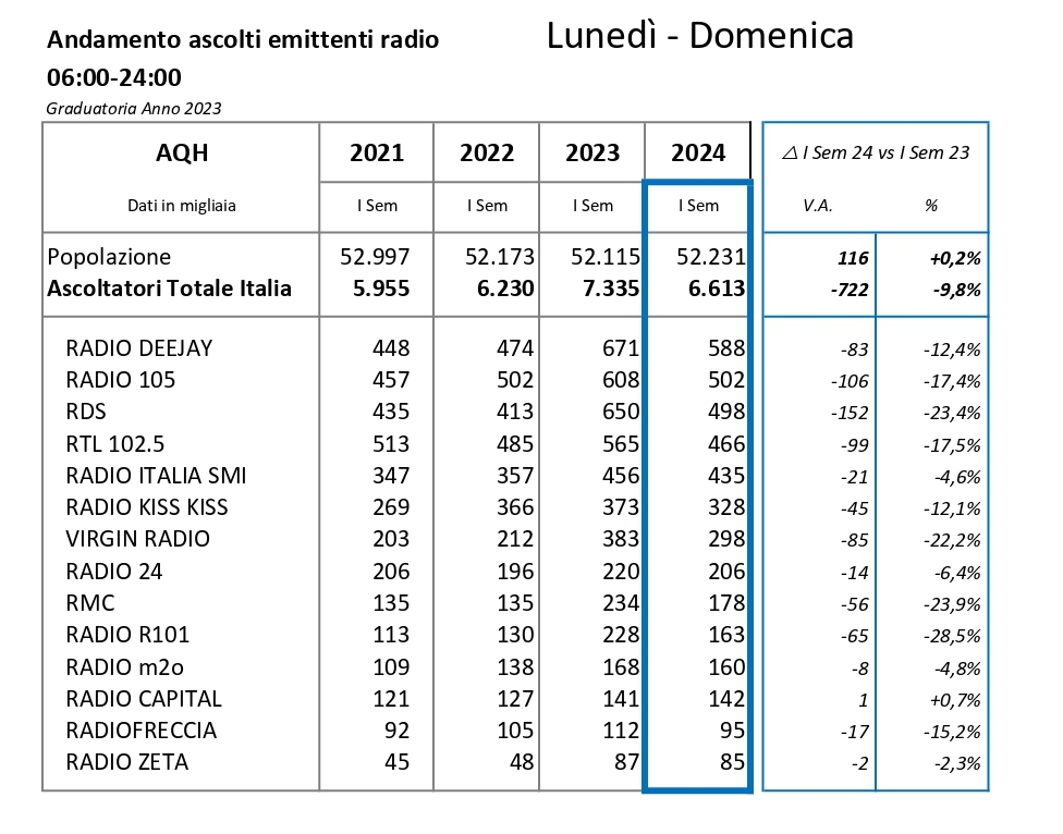 I dati sono relativi al I Semestre 2024 e non vedono presenti le emittenti del Gruppo Rai che rientrerà in rivelazione nel 2025 con l’operatività di Audiradio. I confronti sono stati effettuati con il dato omologo dell’anno precedente. L’ordine delle emittenti è effettuato sul dato 2024.