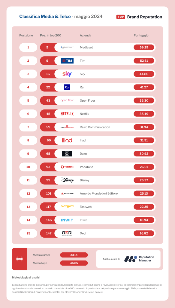 L’osservatorio prende in esame, per ogni azienda, l’identità digitale, i contenuti online e l’evoluzione storica, calcolando l’impatto reputazionale di ogni contenuto sulla base di un modello che valuta oltre 100 parametri. In particolare, nel periodo 1° gennaio-31 maggio 2024, sono stati rilevati e analizzati oltre 6,3 milioni di contenuti online relativamente alle oltre 200 aziende incluse nel paniere.
