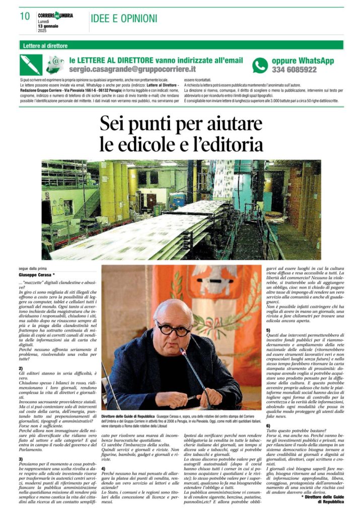 5) Questi due interventi permetterebbero di investire fondi pubblici per il riammodernamento e ampliamento della rete nazionale delle edicole (ritornerebbero ad essere strumenti lavorativi veri e non crepuscolari luoghi senza futuro) e nello stesso tempo farebbero ritornare la carta stampata strumento di prossimità: dovunque avendo voglia si potrebbe acquistare uno prodotto pensato per la diffusione della cultura. E questo potrebbe avvenire proprio adesso che tutte le piattaforme mondiali social hanno deciso di togliere ogni forma di controllo per la correttezza e la verità delle informazioni, abolendo ogni modalità che possa in qualche modo proteggere gli utenti dalle fake news.