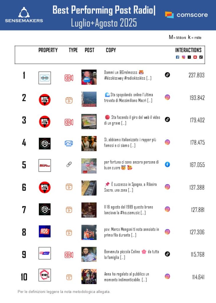 Il ranking dei Best Performing Post risulta più eterogeneo e “democratico”, sia per la varietà delle emittenti coinvolte sia per la pluralità delle piattaforme utilizzate. Se a giugno figuravano soltanto due radio, tra luglio e agosto il numero sale a sette, con contenuti diversificati e distribuiti su più piattaforme.