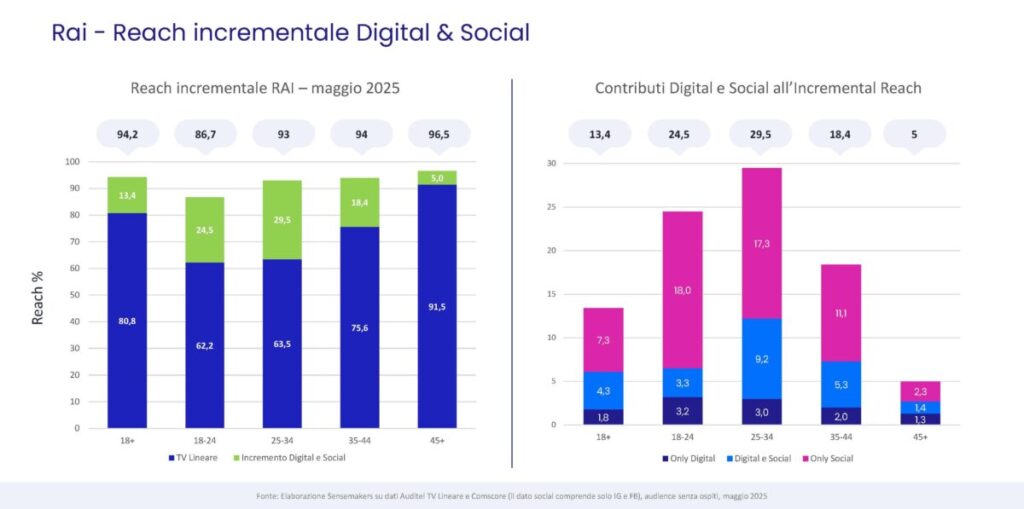 Emblematico è il caso RAI: la deduplica rispetto alla reach televisiva delle properties digitali e dei canali social effettuata tramite Techedge dimostra che la reach complessiva di RAI sul totale della popolazione italiana nel mese di maggio ha raggiunto il 94,2% dei maggiorenni incrementando del +13,4% quella televisiva. Ovviamente sono ancora più forti i contributi delle reach incrementali digitali e social sui segmenti giovanili con un + 24,5% sulla fascia 18-24 anni e +29,5% su quella 25-34 in cui la componente social gioca un ruolo primario.