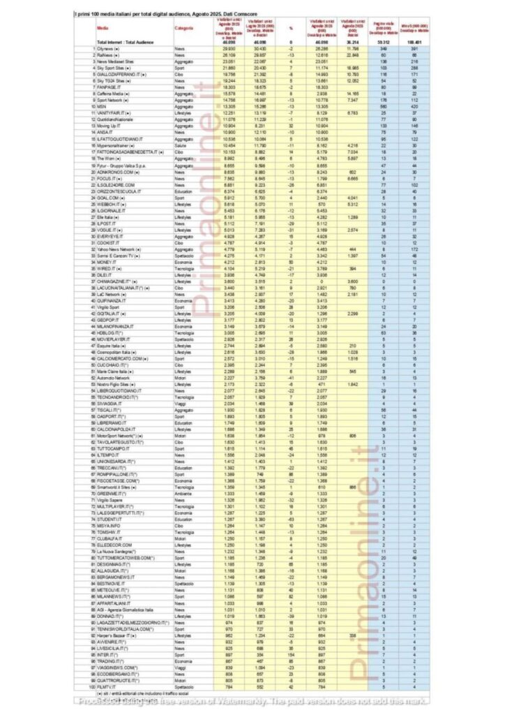 I dati Comscore di agosto, relativi alle prime 100 testate online, evidenziano un calo nell’accesso ai contenuti editoriali tramite social, confermando un trend già registrato l’estate scorsa. Citynews guida la classifica, seguita da una Rai News. L’avvio della Serie A spinge Sky Sport.