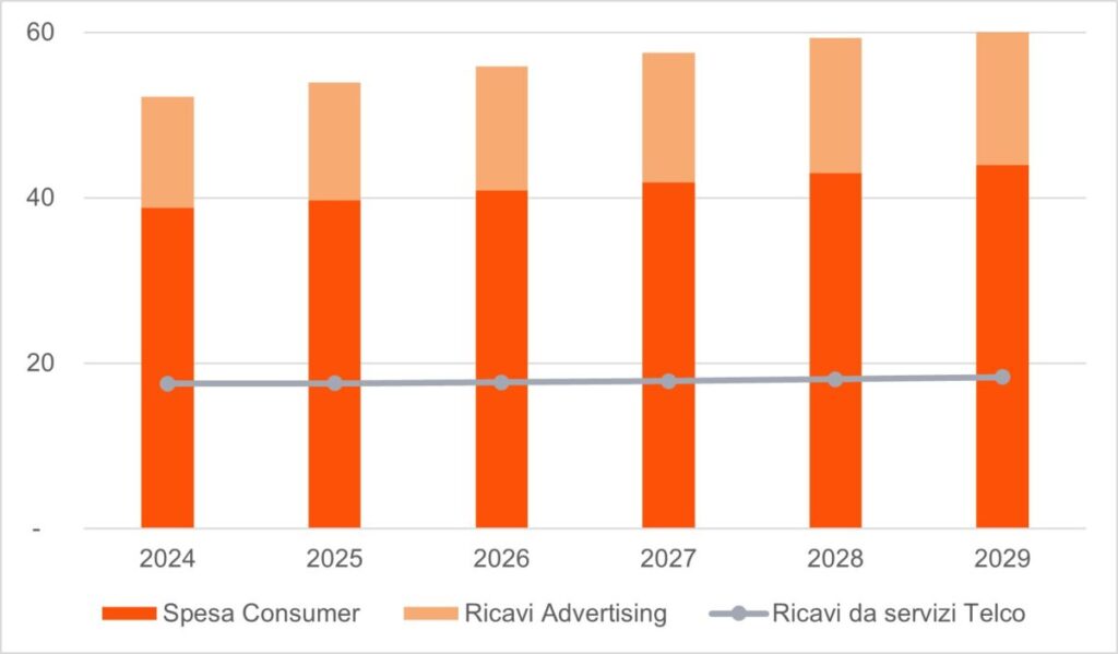 All’interno del segmento, la componente Video si conferma tra le più dinamiche, superando il Paid Search in termini di ricavi e raggiungendo 2,2 miliardi di euro nel 2024, con una crescita media annua stimata dell’8,4% entro il 2029.