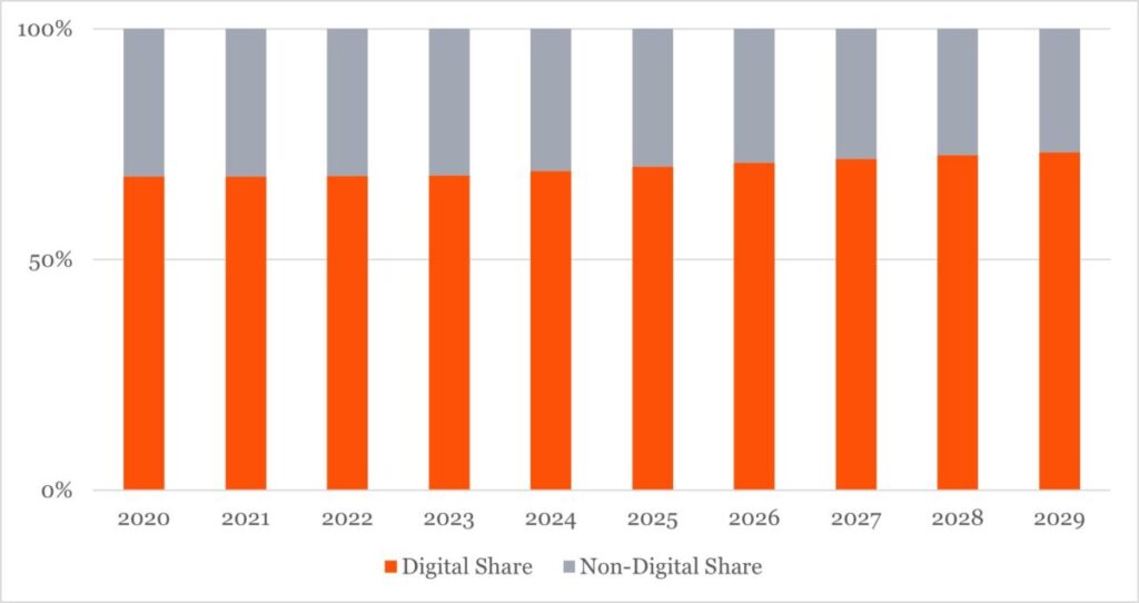 In generale, a guidare la crescita del mercato è la componente digitale, che rappresenta il 69,2% dei ricavi totali nel 2024 e il cui valore è destinato a crescere con un CAGR 24-29 del 4,3%. In particolare, la rapida diffusione dell’Intelligenza Artificiale sta costringendo le aziende a ripensare i propri modelli di business per rimanere competitive; dalla produzione di contenuti alla distribuzione e alla monetizzazione, le organizzazioni si stanno adattando per integrare le nuove tecnologie, semplificare i modelli operativi e soddisfare le aspettative in continua evoluzione dei consumatori.