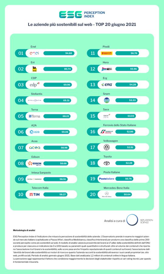 Altro di Roberto Borghi Top 200 società percepite come più sostenibili sul web. Performance superiore alla media ... Quali sono le aziende percepite come più sostenibili? Reputation Science, società leader in Italia nell’analisi e gestione della reputazione, ha elaborato l’indice ...